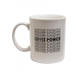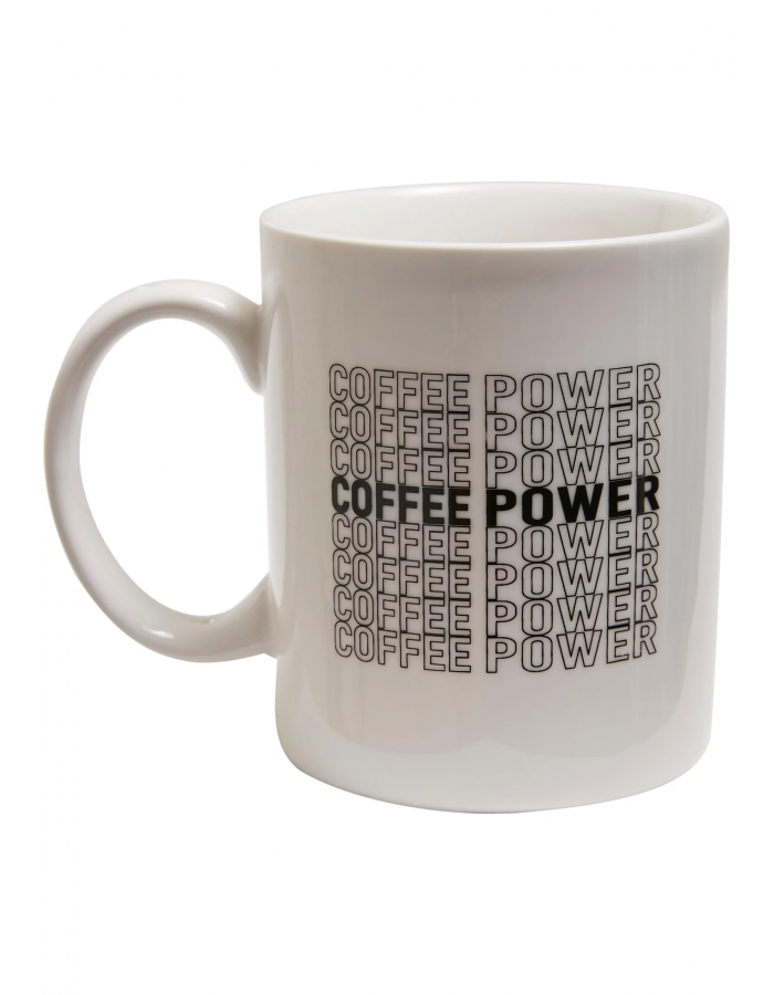 The plain-colored ceramic coffee cup bears the print "Coffee Power" eight times as a vertical row. One lettering is written in bold, the other words outlined. The motif is repeated with a print on the underside of the coffee cup – a hand with a coffee cup in it and a halo above it. The cup offers a large and secure handle.