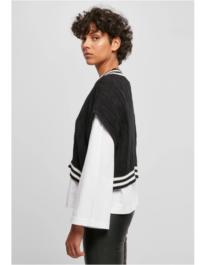 This super short cut women's knit sweater vest is a succeeded fashion piece. Its wide, striped rib cuffs on hem and V-neckline set strong accents and are reminiscent of the famous college style. The chosen cable knit pattern is a nice contrast to the overall design. The feminine, casual style is rounded off by a subtle rib finish at the armhole. The women's college sweater vest is made of cotton and a casual oversize fit.