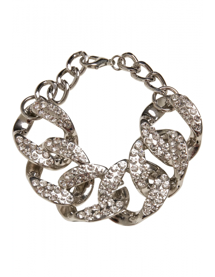 The bracelet’s foundation lies in six large curb chain links, which harmoniously cling into each other and are set with a double row of rhinestones. The bracelet measures 21 centimeters and is made of a zinc alloy and iron.