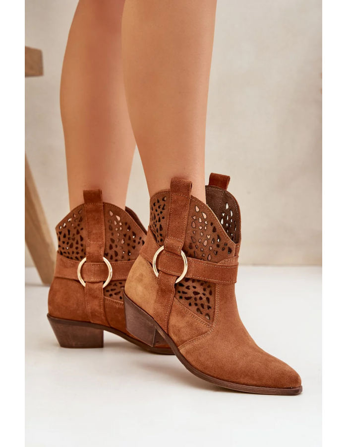 Stylowe i eleganckie botki damskie wykonane z naturalnego zamszu, które doskonale łączą modny wygląd z wygodą użytkowania. Model osadzony na niskim obcasie, idealny na co dzień i do bardziej formalnych stylizacji. Ażurowa cholewka ozdobiona delikatnym akcentem nadaje im wyjątkowego charakteru. Szpiczaste noski optycznie wysmuklają stopę, dodając szyku każdemu zestawowi. To doskonały wybór dla kobiet ceniących jakość, styl i komfort. Przy wyborze rozmiaru prosimy sugerować się tabelą rozmiarów.